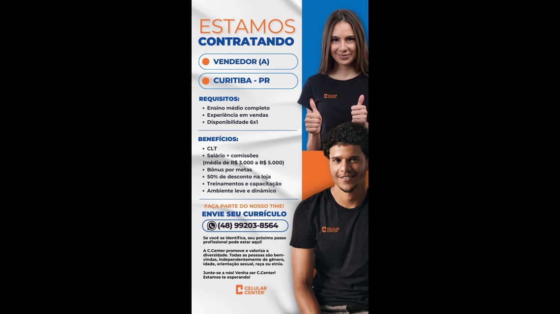 Encaminhe seu currículo também pelo nosso whatsapp RH Cel.Center: (48) 9 9203-8564